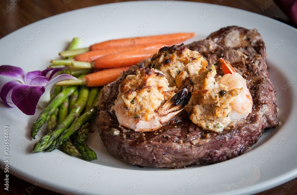 Crab Stuffed Shrimp and Steak with Carmelized Shallots and Garlic Thyme Butter