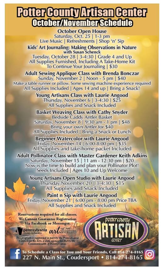 Join the festive fun at the Potter County Artisan Center on Friday, November 21st for a Holiday Paint n Sip taking place from 6:00 pm -8:00 pm.