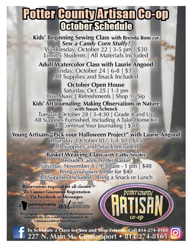 Young Artisans Open Art Studio will be held on Thursday November 20th from 3:00 pm to 4:30 pm at the Potter County Artisan Center in Coudersport. Students will be given the option of designing their own project or following a sample painting in watercolor or acrylic. Supplies and snacks will be provided. Price of the…