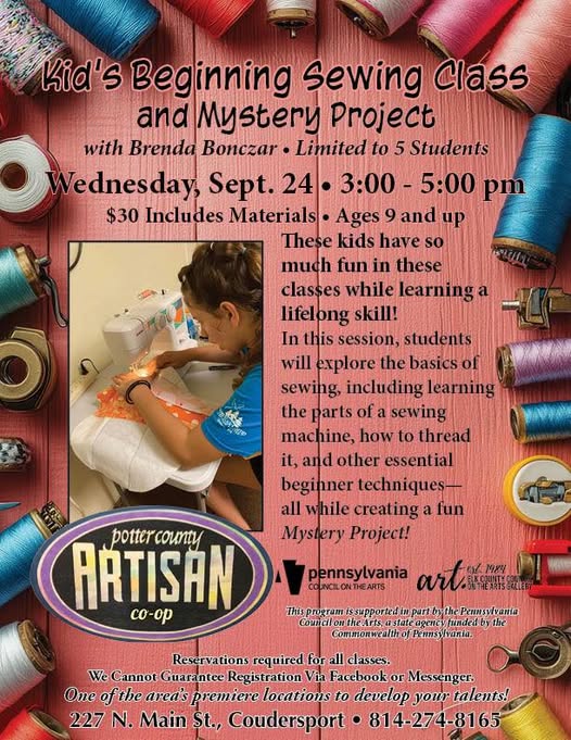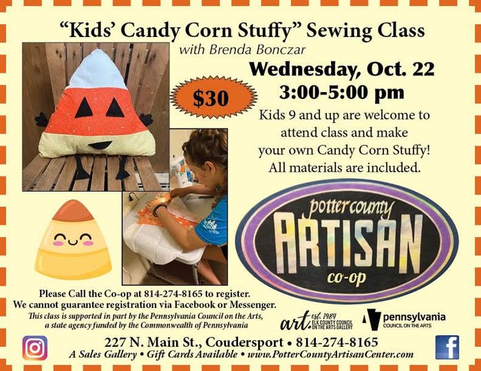 The Potter County Artisan Center is offering a sewing class for children aged 9 and up to participate in a Candy Corn Stuffy sewing activity, where they will learn valuable skills and create a cheerful project to take home. Join instructor Brenda Bonczar on Wednesday, October 22nd at 3:00 pm for this two-hour class designed…